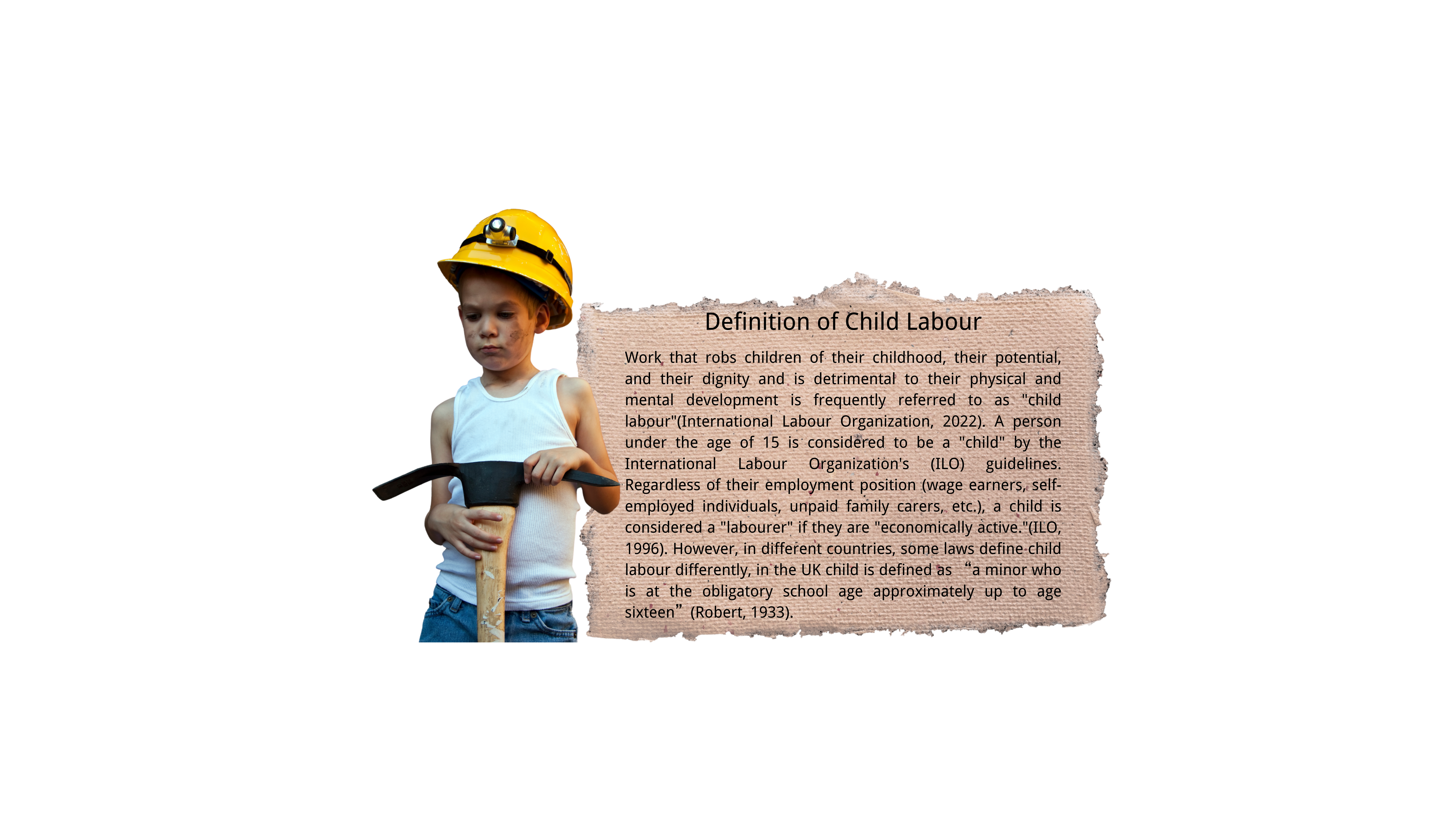 Therefore, it is necessary to place the UK's child labor problem in a global context. A significant difference is likely to exist between the reasons for exploitation of child labour in the past and today's responses, and these need to be located in broader social processes and structures to do with the effects of globalization (market forces, technology, labour flexibility, and the rise in consumerism) and other external factors – including climate change, which may already be having marked effects upon how children in rural areas spend their time in food production, as their communities experience profound weather events such as severe droughts or floods (Morrow,2010). Some underdeveloped areas lack social security for children, and families can only relieve family burdens through children's labor.(ILO, 2019).The number of child workers worldwide will rebound to 160 million in 2021 for the first time in 20 years, according to a joint report by the ILO and UNICEF(ILO, 2021).The loss of informal sector jobs, increased poverty and lack of social protection due to the COVID-19 pandemic, combined with widespread school closures, has led to an increase in child labour across developing countries(Idris, 2020).